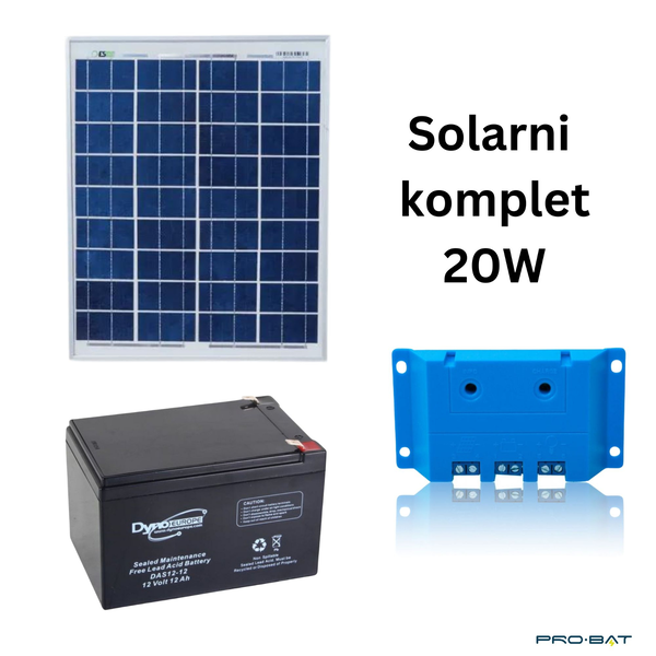 Solarni komplet 20W je namenjen za razsvetljevanje manjših prostorov, kot so terase, letni vrtovi, garaže... Uporablja se lahko za napajanje 12V električnih pastirjev, za polnjenje mobilnih telefonov preko 12V vtičnice.