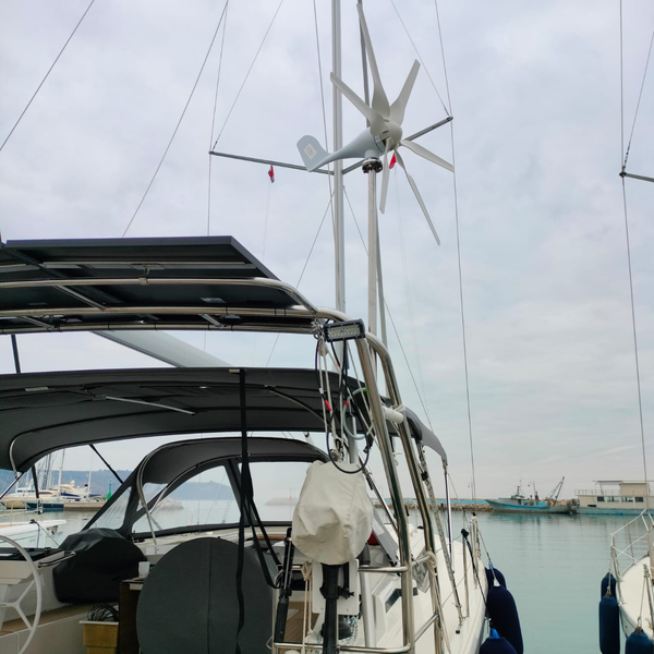 Enostavna namestitev: Vetrna turbina je pritrjena s prirobničnim priključkom in je opremljena z orodji, potrebnimi za vgradnjo. Vetrnica vključuje regulator MPPT. Obris generatorja, krila in pritrdilni material so natančno zasnovani tako, da olajšajo namestitev.