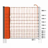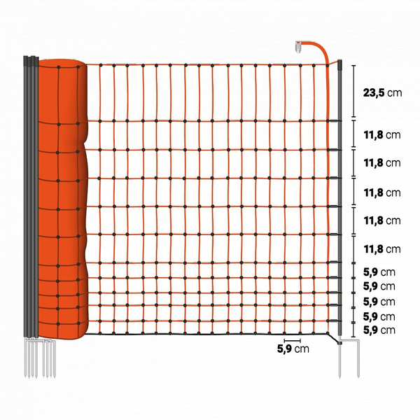 Ta 16-palčna električna mreža ima 11 vodoravnih vodilnih vrvi z 3 × 0,20 mm debelo žico iz nerjavečega jekla + 1 spodnja vrsta (črna žica) je neprevodna, izolacijska. Zaradi manjših očes in skupne višine je primerna za perutnino, gosi, race, purane ali druge živali kot so večji psi.